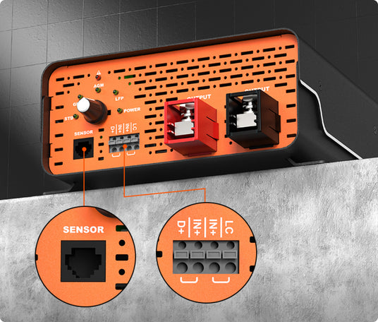- Temperature-Adaptive Charging: RJ11 sensor port adjusts voltage for cold or hot environments to extend battery life (not for lithium batteries).*D+, LC cables, and a temperature sensor are not included.