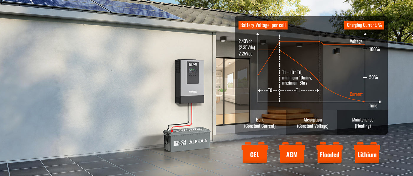 High-efficiency 80A battery charger supports multiple battery types with multi-stage charging and up to 9 units in parallel for flexible system expansion.